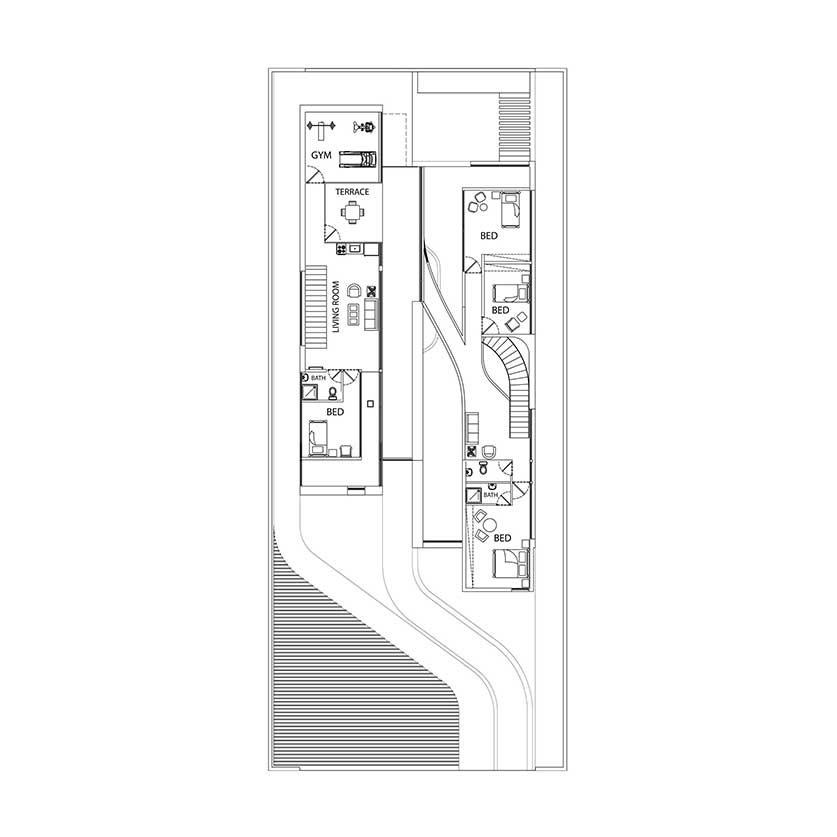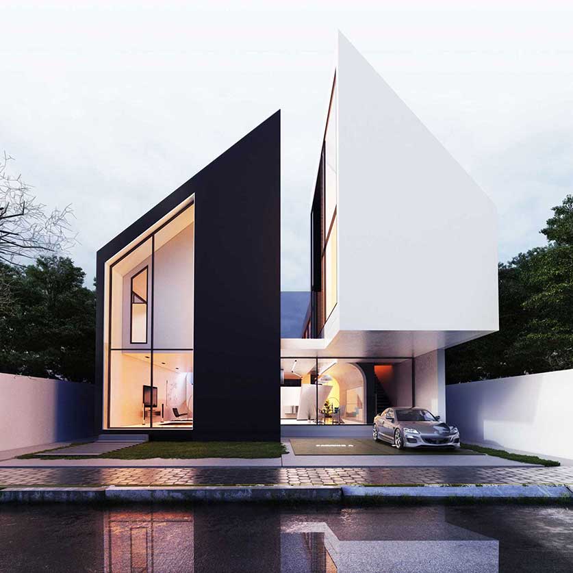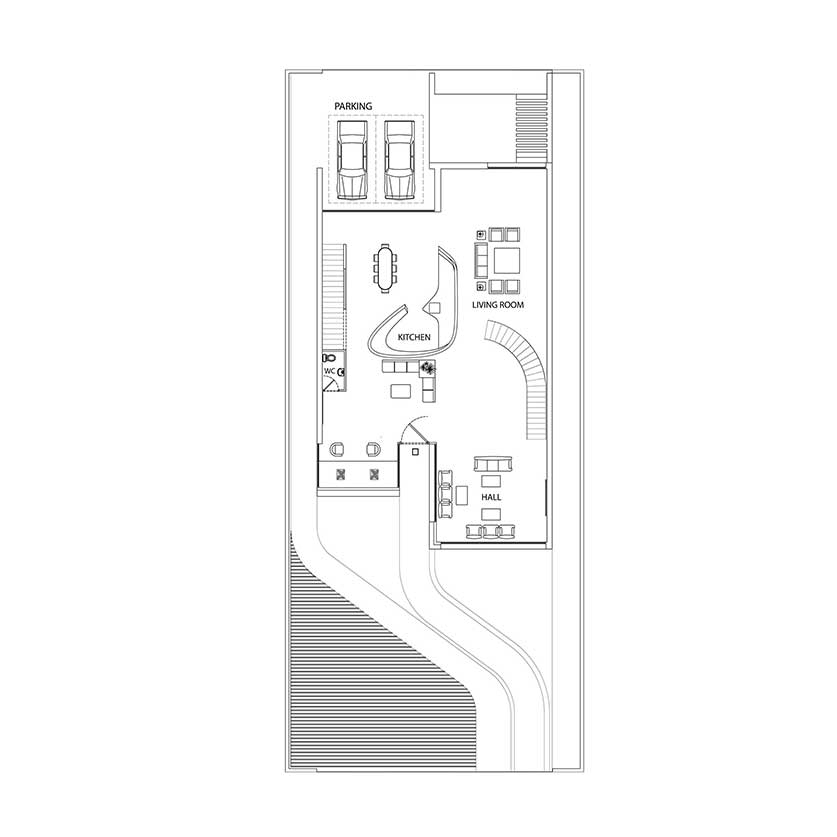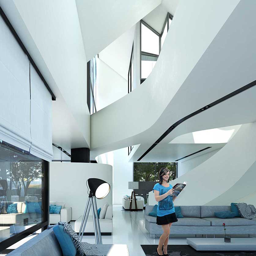 توجه به استفاده از سقف های شیروانی با ماهیتی امروزی می تواند تصویر ذهنی و نوستالژیک از تجسم ساختمان های ویلایی منطقه را در یک قالب جدید برای ما شکل دهد .طراحی فضاهای سیال در تعامل با ساختار شیروانی پروژه تجربه حضور در یک فضای جذاب و خاطره انگیز را برا ما شکل می دهد پله سیال در طبقه همکف و یک پل معلق میان طبقات در طبقه اول بر سیالیت فضای داخلی پروژه افزوده است . تفکیک فضاهای عمومی و خصوصی و ارتباط دقیق شمالی و جنوبی بازشو ها برای به حداکثر رساندن فرصت تهویه طبیعی هوا از ویژگی های دیگر این ویلای مدرن و زیبا است . همچنین وجود پنجره ها و باز شو های بلند می تواند حداکثر ارتباط بصری با فضای سبز و طبیعت مقابل آن را پدید آورد .در این راستا کل فضای طبقه همکف به صورت فلت و یکسره طراحی شده و فقط یک آشپزخانه مرکزی و یک سرویس بهداشتی در ضلع غربی تعبیه شده است و هیچ فضای دیگری متراژ طبقه همکف را اشغال نکرده است در نتیجه ارتباط هال و نشیمن به صورت بی واسطه متراژی نزدیک به 200 متر مربع را شکل می دهندکه هم از سمت شمال و هم از سمت جنوب با بازشو هایی پانوراما , نور و تهویه هوا را به داخل هدایت می نمایند. این امکان این فرصت را برای ما فراهم می کند تا در روز های معمول سال با باز شدن پنجره های دو سوی شمالی و جنوبی ساختمان بیشترین میزان کوران هوا ممکن باشد و بدون نیاز به تاسیسات مکانیکی رطوبت محیط کاهش یابد .