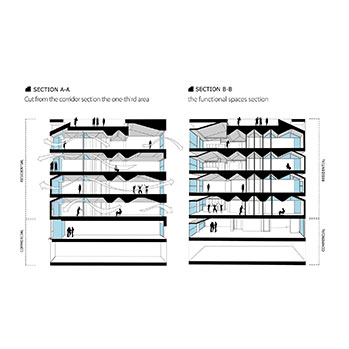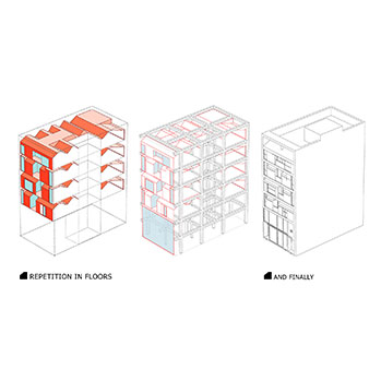 Many projects that architectural offices in Iran face these days have a common story. The client goes to the architectural office, with the municipal certificates of the architectural plan and the pre-designed structure, which sometimes the architects can succeed in changing the existing situation and sometimes they can't, and they are condemned to the limited design of the facade and minimal changes in the architectural plan. This project belongs to the second category. We have been thinking for a while about what to do if we don't want to stop doing this kind of projects that belong to the second category! In fact, if we consider the structural grid surrounded by existing buildings as an existing reality (picture A) And on the other hand, consider conventional designs in the construction process as an economic and non-negotiable reality from the employer's point of view (picture B) . Is there any other chance to escape from this condemned condition and repetitive existing typology, which can be used as an opportunity for a little penetration and release of capacity for the benefit of the project, so that it does not suffer the inevitable fate of all similar projects! (Photo C Question: In the end, the question is raised, what opportunities can be released in this existing structure that have probably been out of reach until now? Or has less attention been paid to it? In response, it should be said, when a series of facilities are present and dominant in front of our eyes, there is a possibility that at the same time, facilities are absent and out of reach of our sight and observation. A few years ago, in an experimental project, we focused on the issue that if we are focused on the opportunities available in the plan of a conventional residential space, is it possible that some facilities are absent and out of our reach! One of the points that was interesting to us in studying this issue was that if we look at the "section" of that project at the same time, we will realize that usually the entire height in the section of a building is not needed for the functional and visual separation of the spaces in the plan. and we can divide the structure of these living spaces into a "one-third" and "two-thirds" field (picture below) In fact, the primary "two-thirds" area is responsible for the physical and visual separation between spatial functions, while at the same time, the "one-third" area is not permanently accessible by the user (and his physiological needs). It will definitely not bear more responsibility like the "two-thirds" area. As a result, we were interested in thinking how this idea of focusing on the "one third" area of the project can increase the possibility of generating new capacities for the project in the structural grade typology of existing conventional apartments.