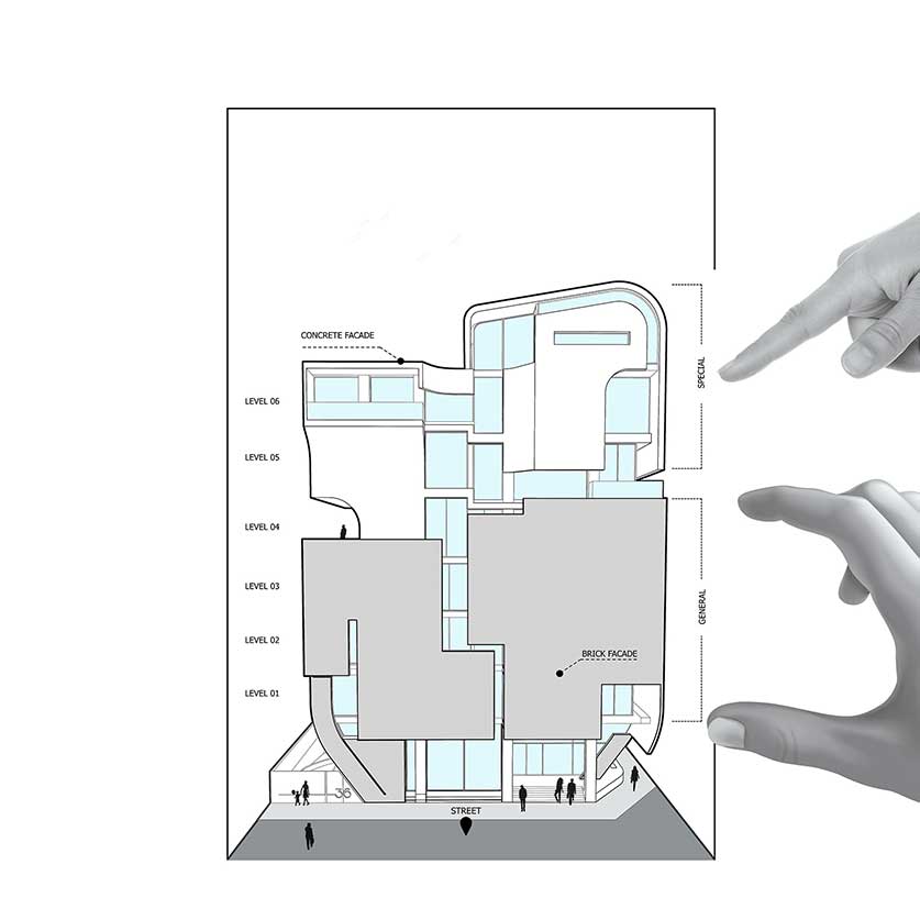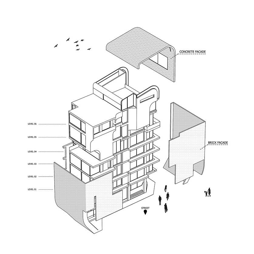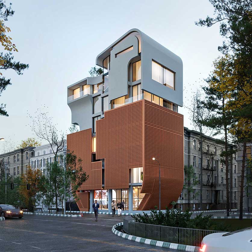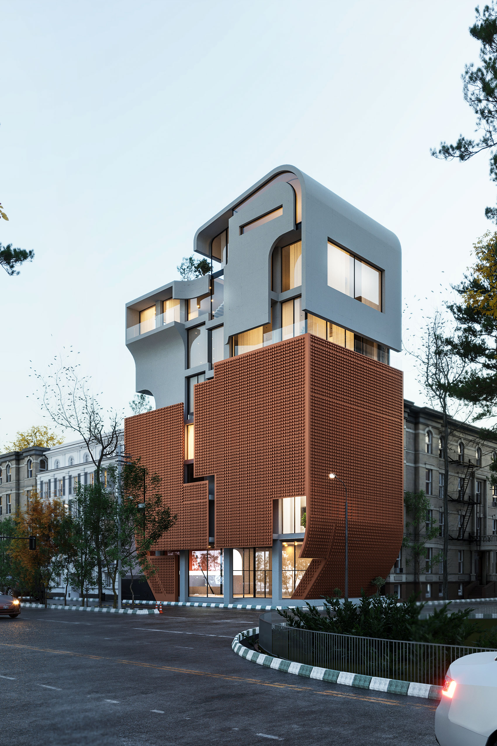 The residential building "four plus two" consists of a double morphological language that separation of these two areas is formed by the urban skyline in the neighborhoods In the lower part (four lower floors), a two-shell facade with a brick texture (opening) is designed introvertedly. which, on the one hand, makes it possible to enjoy a glass panoramic view behind it, and on the other hand, suggests a two-shell climate structure. And in the upper part of it, two units with an extroverted structure in the form of duplex and triplex with the benefit of the city view (according to the customer's needs) are planned .